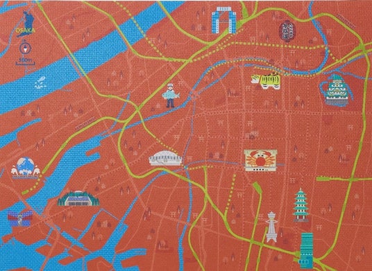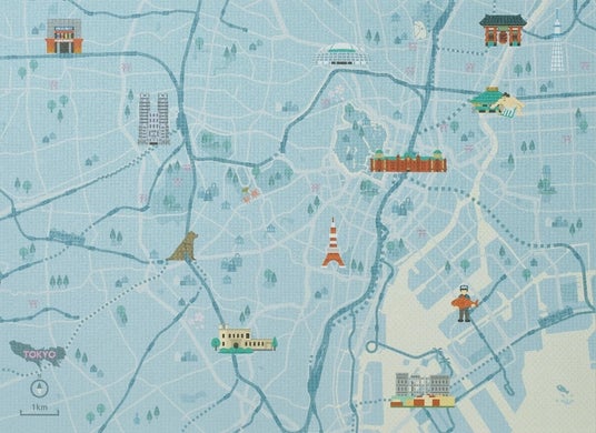 当社が保有する地図データをもとに、東京、横浜、京都、大阪、福岡、長崎、長崎五島の7エリアをイラストマップとしてデザインしました。各地の観光名所をポップなイラストで表現しており、鉄道路線、道路、神社、博物館、空港などが正確な位置に配置されています。