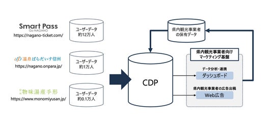 長野県観光機構が保有する各種データ(例:長野県公式観光サイト「Go NAGANO」のアクセスデータやメルマガ会員データ、「温泉ぱらだいす信州」や「物味湯産手形」などの購買データ)の統合