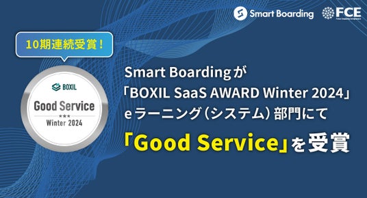 株式会社FCE(本社:東京都新宿区、代表取締役:石川淳悦、東証9564)が提供する人財育成プラットフォーム「Smart Boarding」(スマートボーディング)(https://www.smartboarding.net/) は、スマートキャンプ株式会社(以下「スマートキャンプ」)が主催する「BOXIL SaaS AWARD Autumn 2024」のeラーニング(システム)部門にて「Good Service」を受賞したことをお知らせいたします。このたびで10期連続の受賞となります。