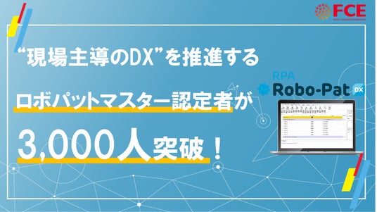株式会社FCE(本社:東京都新宿区、代表取締役社長:石川淳悦、証券コード:9564)が提供する純国産RPAツール「RPAロボパットDX」はRPAを活用して社内の業務改善やDX推進を担う人財を育成する「ロボパットマスター認定プログラム」の認定者が、3,000人を突破したことをお知らせいたします。