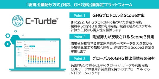 C-Turtleは、削減できるScope3(注5)算定を実現するNTTデータが開発したGHG排出量可視化プラットフォームです。一般的に、Scope3の算定は「活動量(企業の活動規模)」×「排出原単位(市場平均値)」で算定されることが多く、企業の削減努力を反映することが難しいという課題があります。C-Turtleは、Scope3の算定に、サプライヤーの排出量(一次データ)を活用し、サプライヤーの削減努力を自社排出量に取り込むことができる「総排出量配分方式」を採用しています。これにより投融資先の排出量削減努力との連携が可能になり、サプライチェーンを通じたGHG排出量の算定・削減の推進が可能となります。