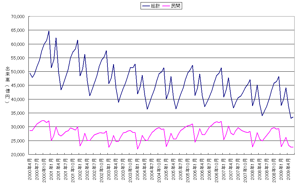 第一四半期を終えた段階で、通期では売上と利益ともに下振れしそうな感じがする。決算短信によると、「景気の下げ止まりから建設現場向けユニットハウスの受注に期待できる状況になってまいりました。また、ユニットハウスの販売におきましては、展示販売場(SPACE-NAVI)を中心に勉強部屋・倉庫等及び中小業者向けの廉価な事務所用ユニットハウスの販売促進に注力してまいります。」として、予想を据え置いている。建設総合統計をグラフ化して、過去の動向を見てみると確かに回復していきそうな状況であるので、売上は回復に向かいそう。