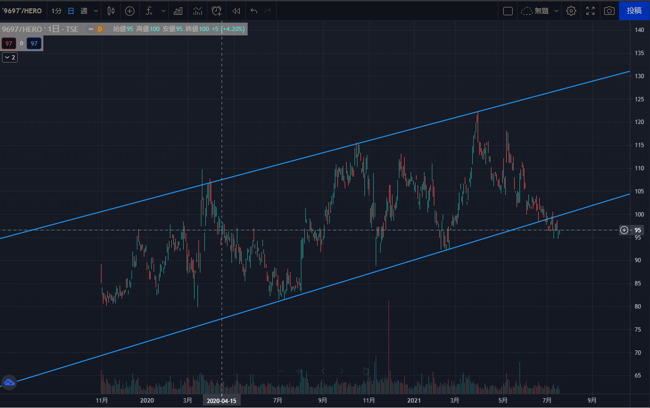 実際にtradingviewなどで 9697/HERO のチャートを見てみると、HEROができたときからずっと続いていた上昇トレンドを初めて下抜けている事がわかると思います。(写真参照)