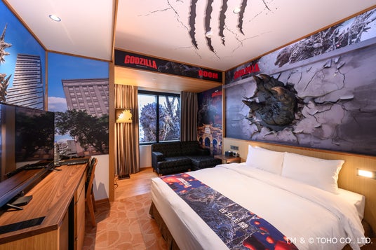 今回は、「ゴジラ、台湾上陸」というテーマでデザインした、ゴジラとのコラボレーションルーム2部屋が登場。それぞれのお部屋は、「ゴジラが台湾の北から/中南部から上陸」というコンセプトで、2部屋で異なるデザインを施しております。壁や天井にはゴジラ襲撃の爪痕や足跡、リアルな造形や鳴き声の他に、台湾各地のロケーションと融合したデザインのリアルさ、ユニークなベッド周りのデザインなど、ゴジラの台湾上陸をお部屋いっぱいの驚きと楽しさで演出します。