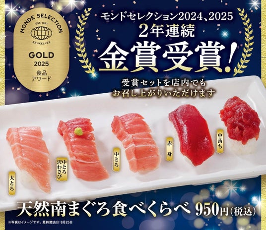 このたびの受賞を記念し、2025年6月3日(火)より全国の魚べい・元気寿司各店舗にて、「天然南まぐろ食べくらべ」を提供いたします。