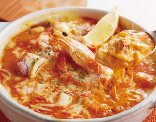 濃厚でまろやかな海老トマトクリームが、とろ~りチーズと合わさったシーフードドリア。