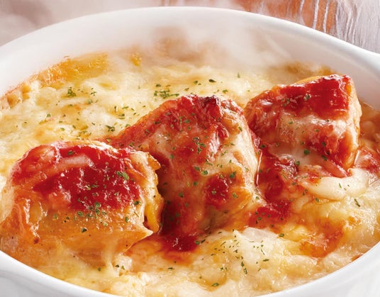 とろりとしたホワイトソースと濃厚チーズがカリっと焼き上げたチキンに絡みます。