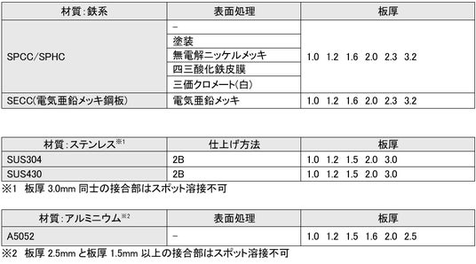 対応材質・板厚・表面処理
