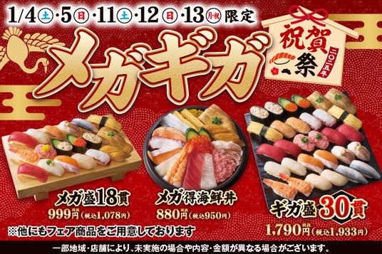 KOZOホールディングス株式会社の子会社である株式会社小僧寿しは、持ち帰りすし店「小僧寿し」にて、2025年1月4日(土)~1月5日(日)・1月11日(土)~13日(月・祝)の期間限定で『メガギガ祝賀祭』を開催します。