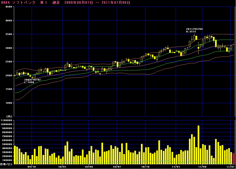 週足では継続して緩やかにバンドが切りあがっており、3,500円近くまでは上値余地があるのではなか?と思います。